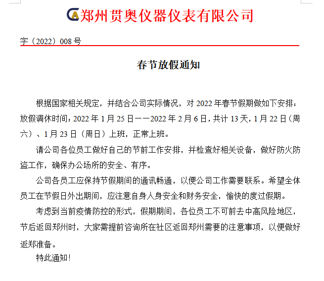為了讓公司員工過一個歡樂祥和的春節(jié),結(jié)合公司整體業(yè)務情況,現(xiàn)將春節(jié)放假作以下安排: