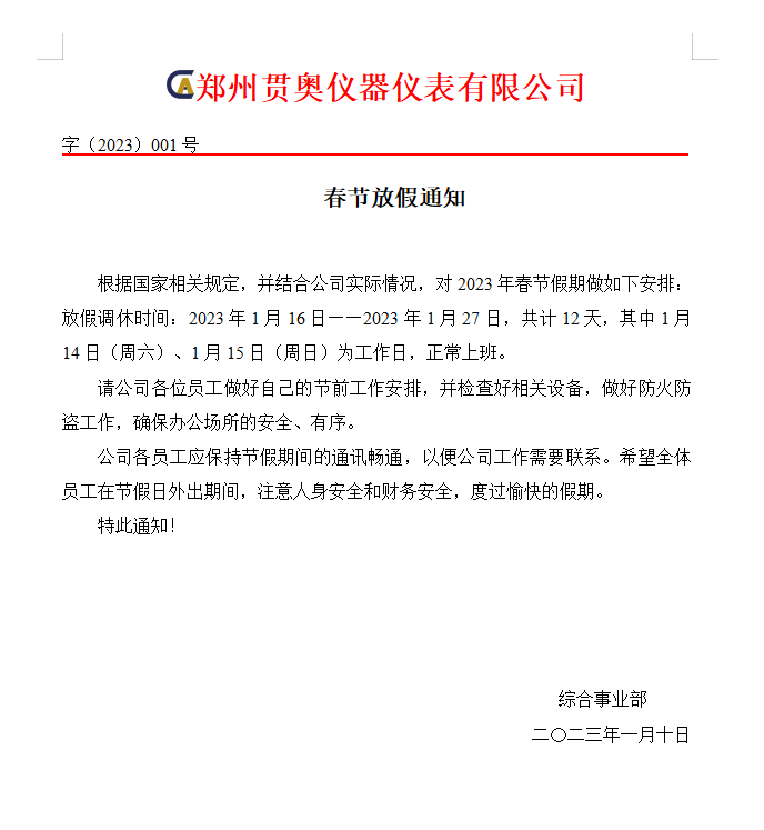 在此,感謝大家在過去一年里對鄭州貫奧儀器儀表有限公司的支持與信任。同時也希望在新的一年里,鄭州貫奧儀器儀表有限公司能繼續(xù)得到大家的關注及支持,并且鄭州貫奧儀器儀表有限公司也會一如既往地為大家提供更好的產(chǎn)品和服務!
