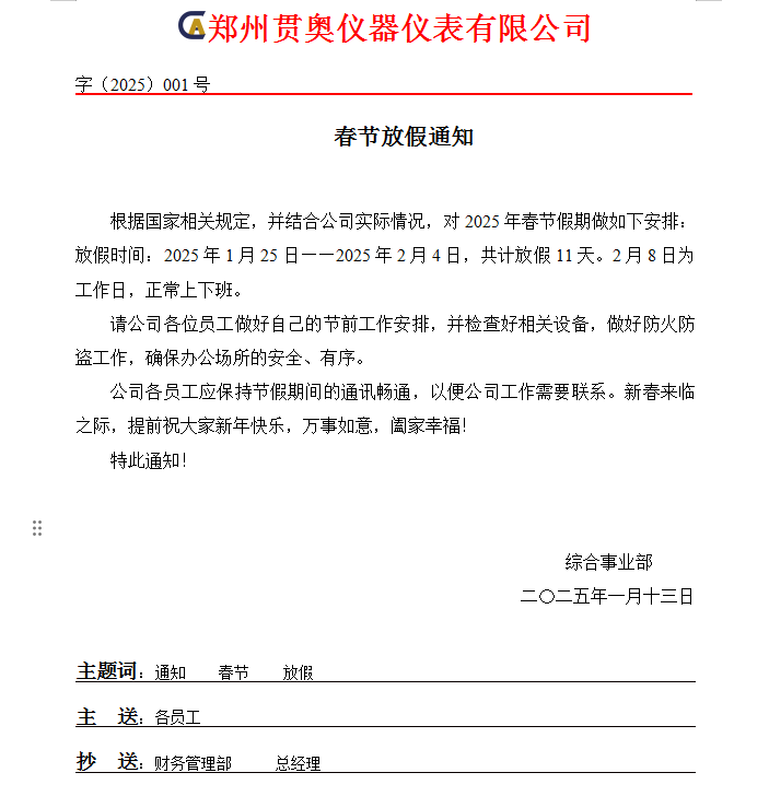 根據(jù)國家法定節(jié)假日安排,結合公司實際情況,2025年春節(jié)假期具體安排如下: